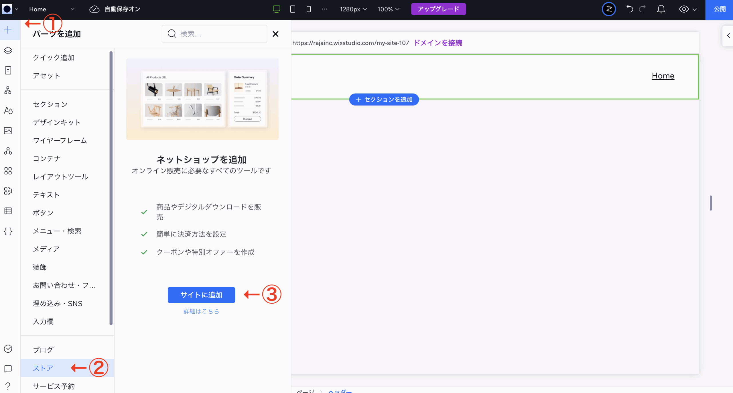 他にも作成済みのサイトにWix ストアを追加することもできます。
