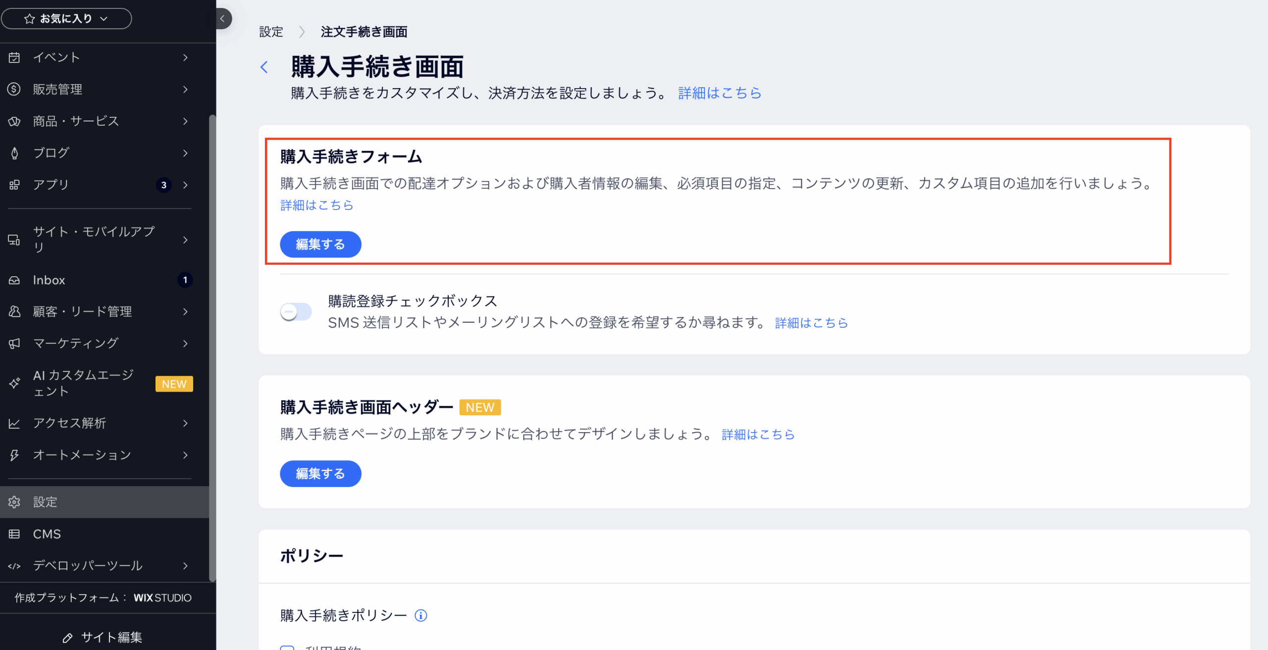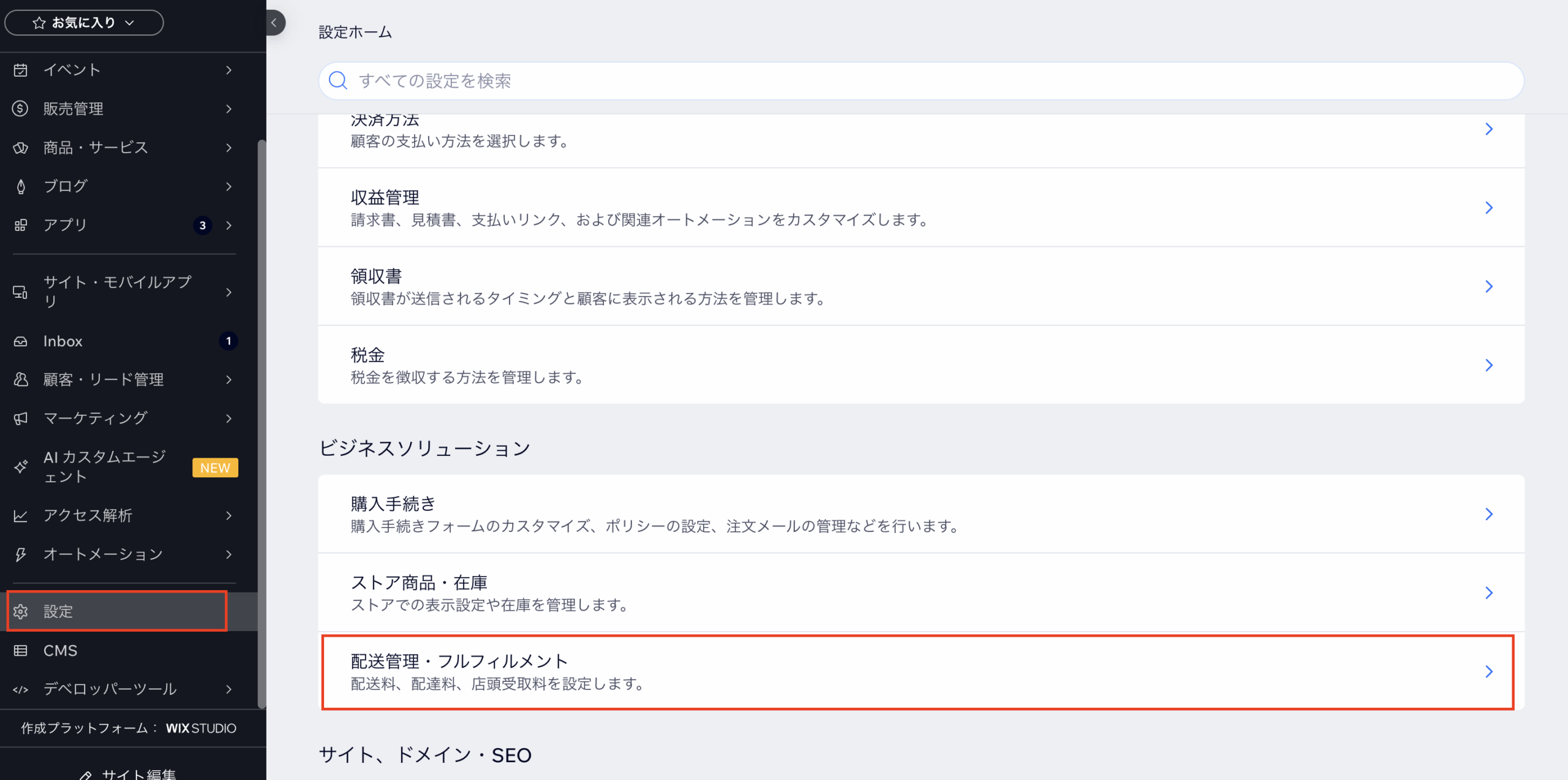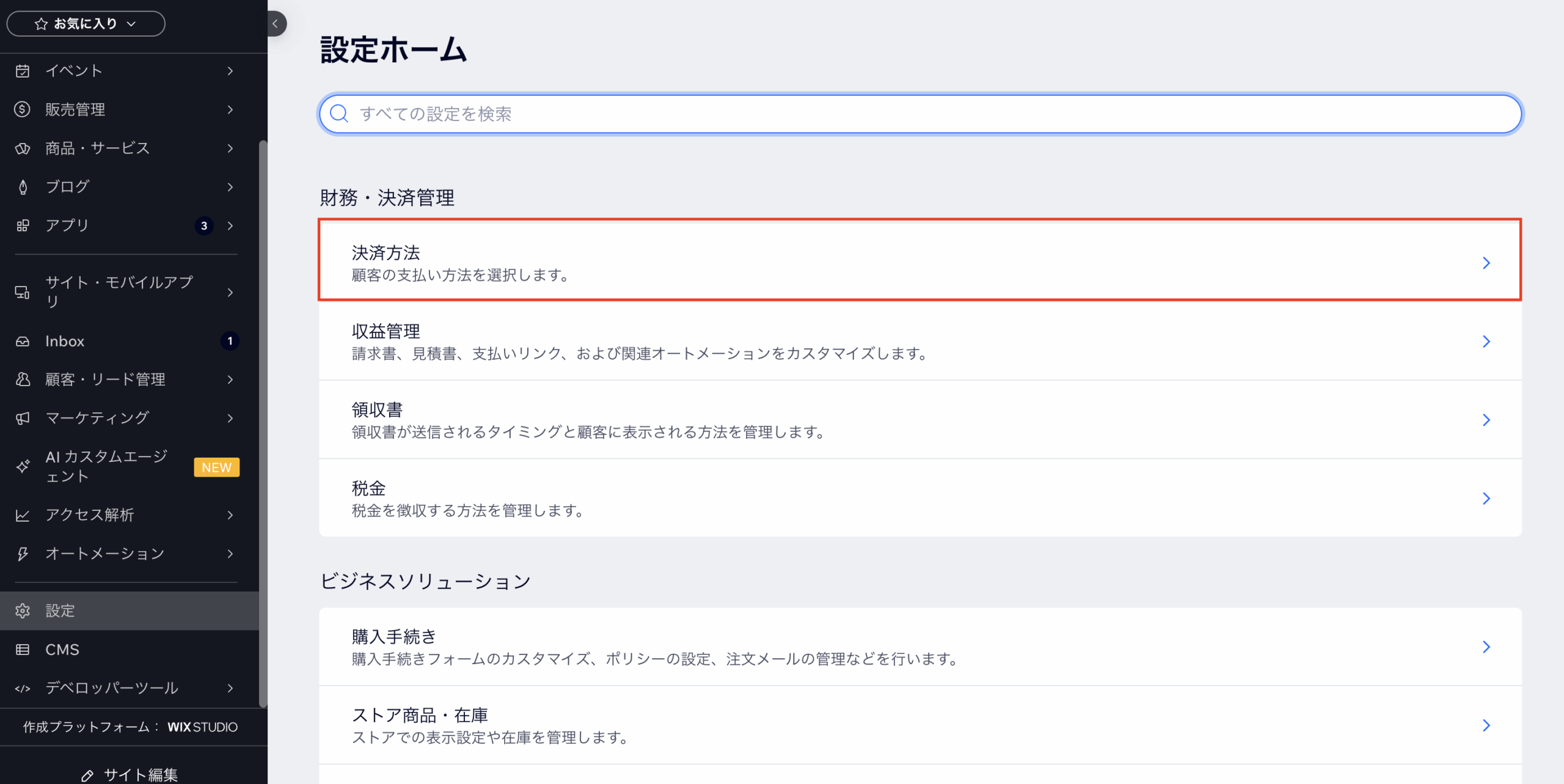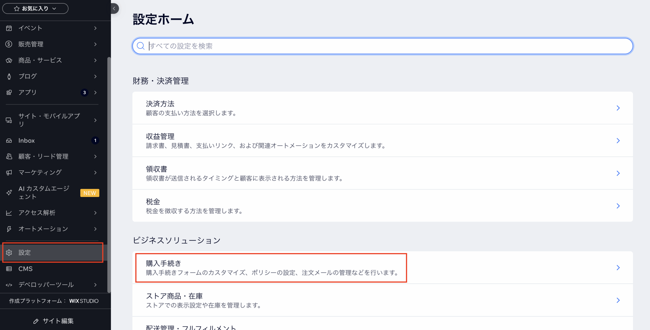 ダッシュボートの「設定」→「ビジネスソリューション」→「購入手続き」からWix ストアの設定ページへ。