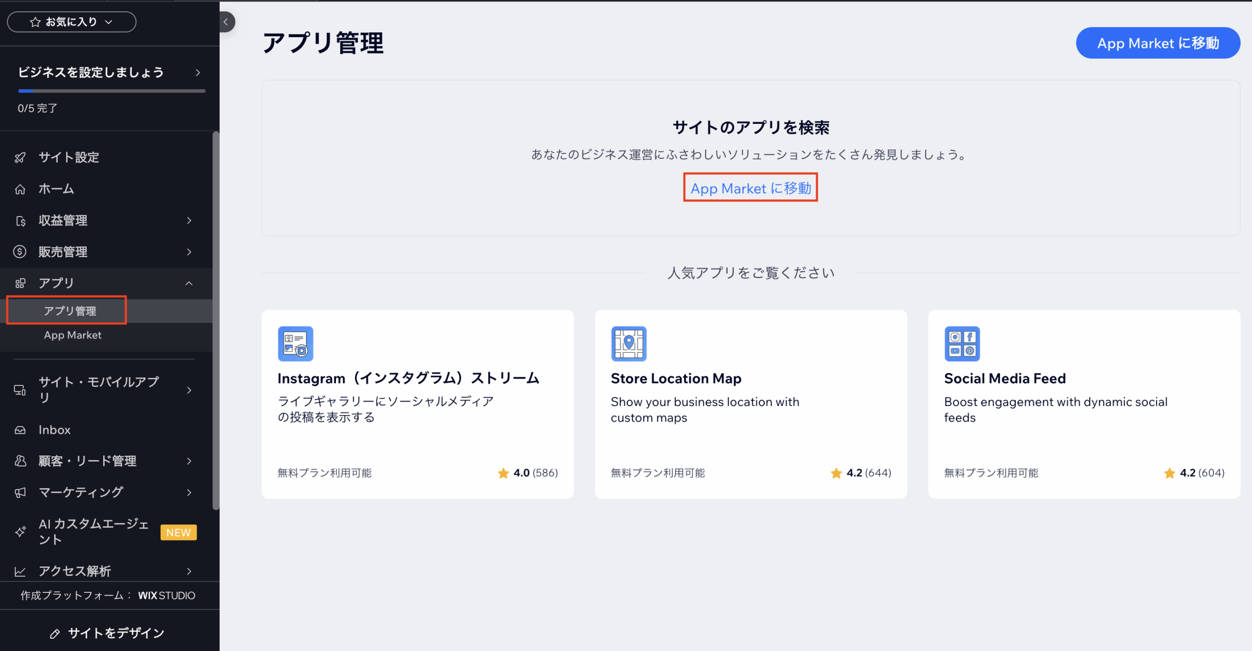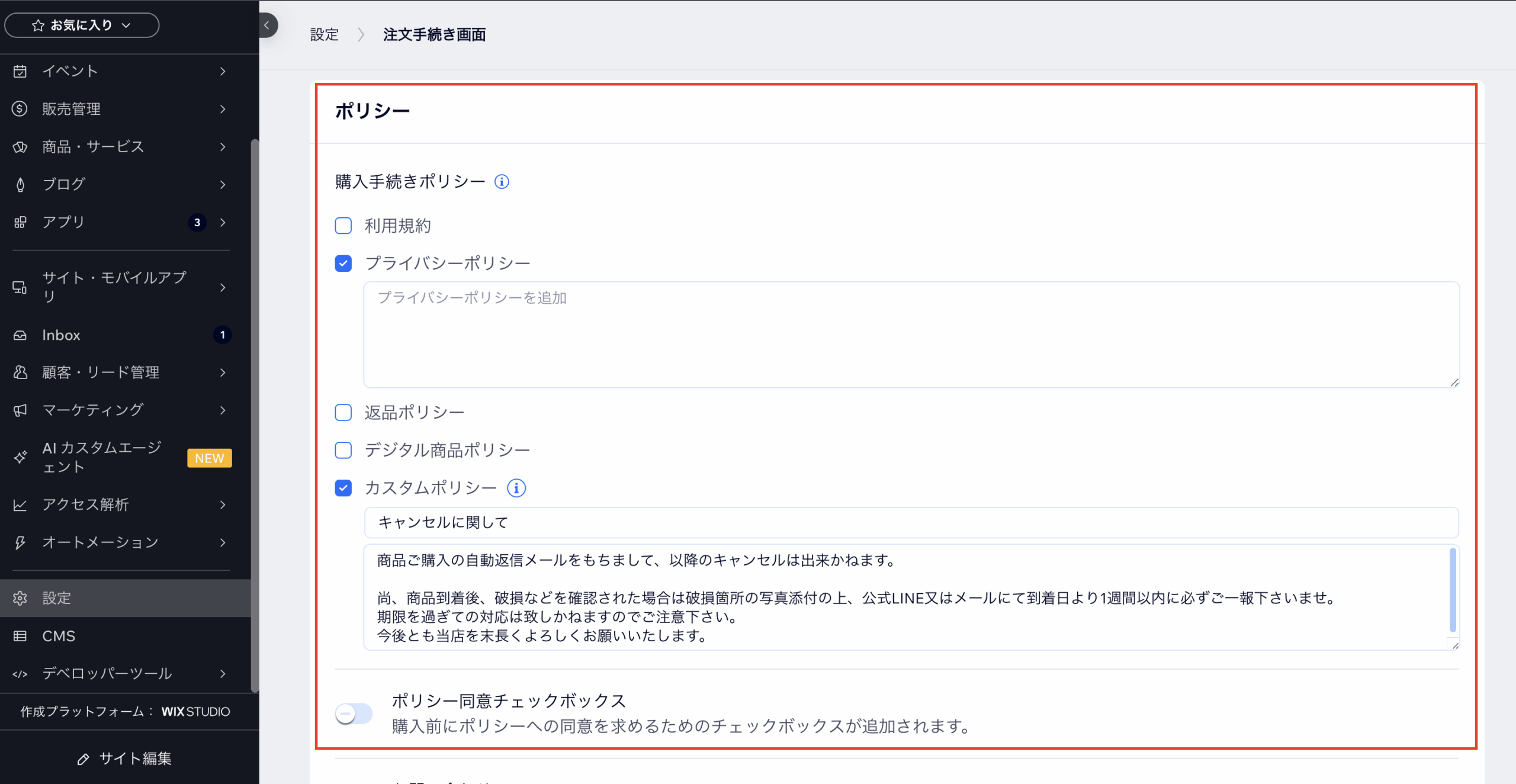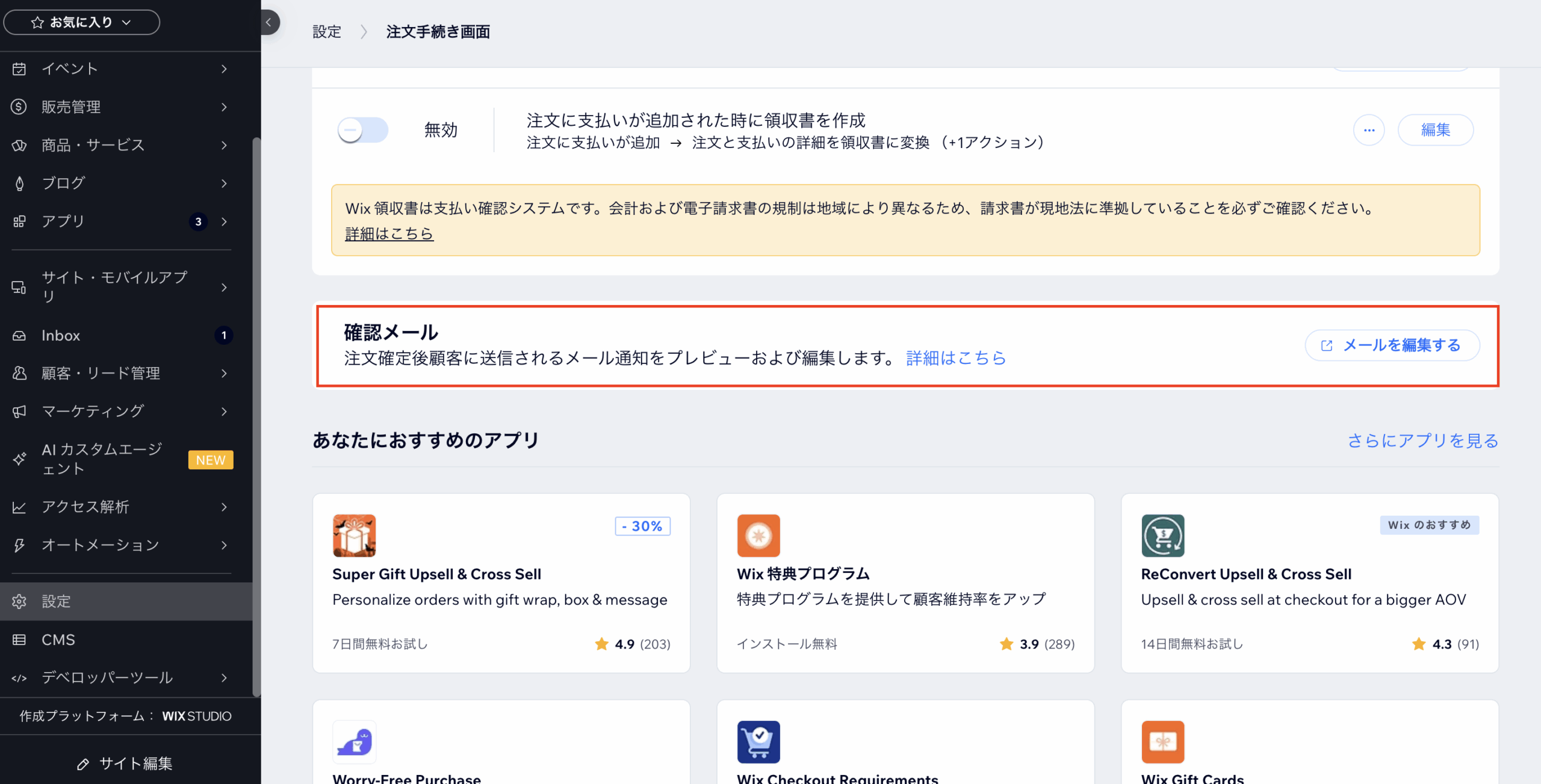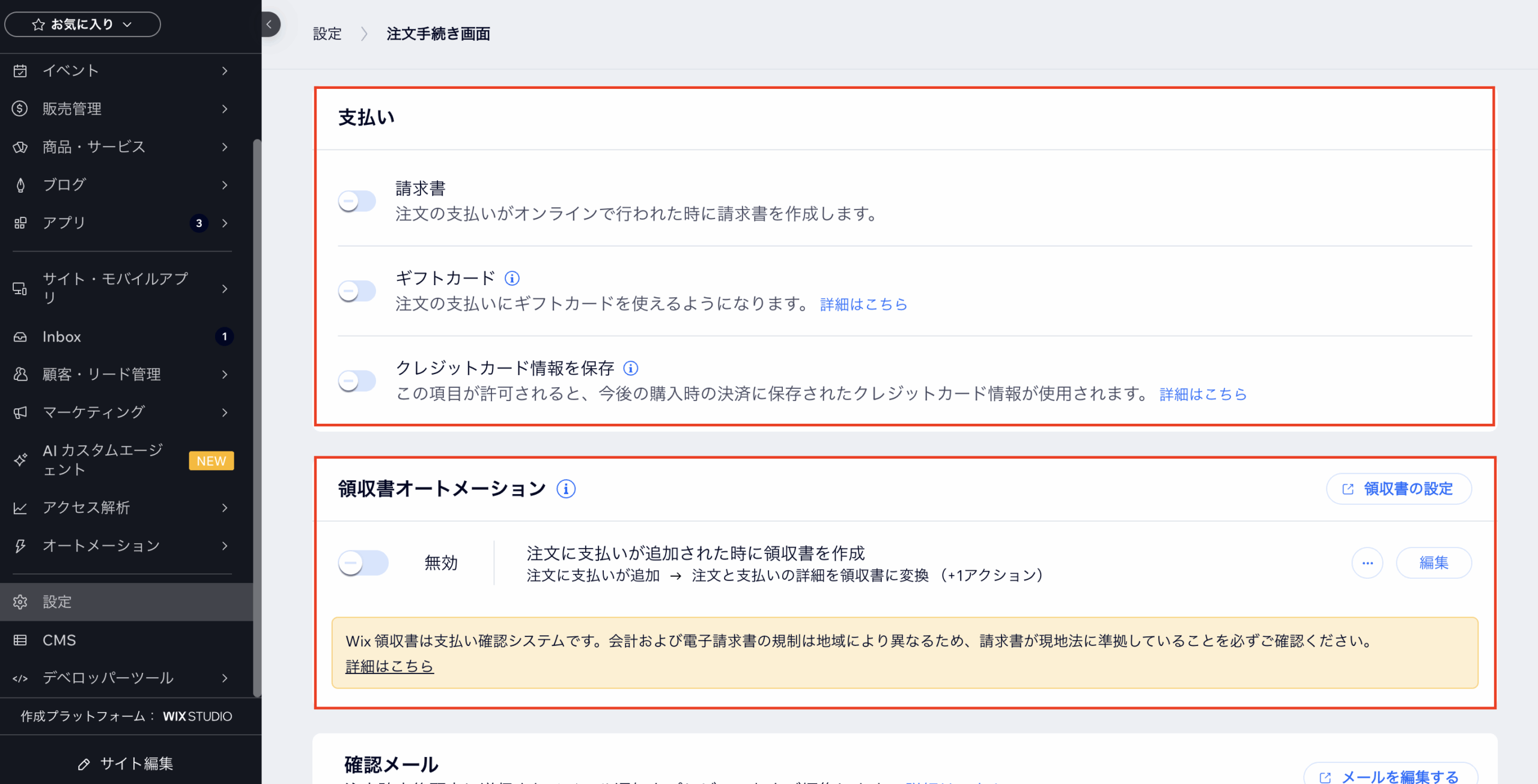 ダッシュボートの「設定」→「ビジネスソリューション」→「購入手続き」からWix ストアの設定ページへ。