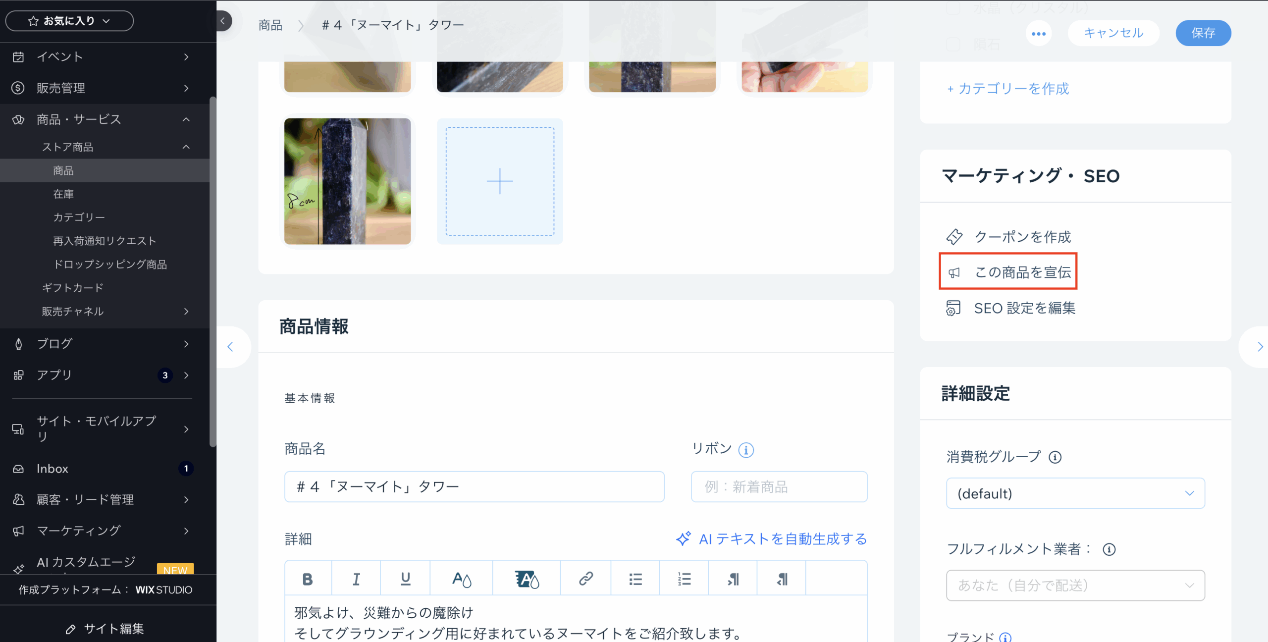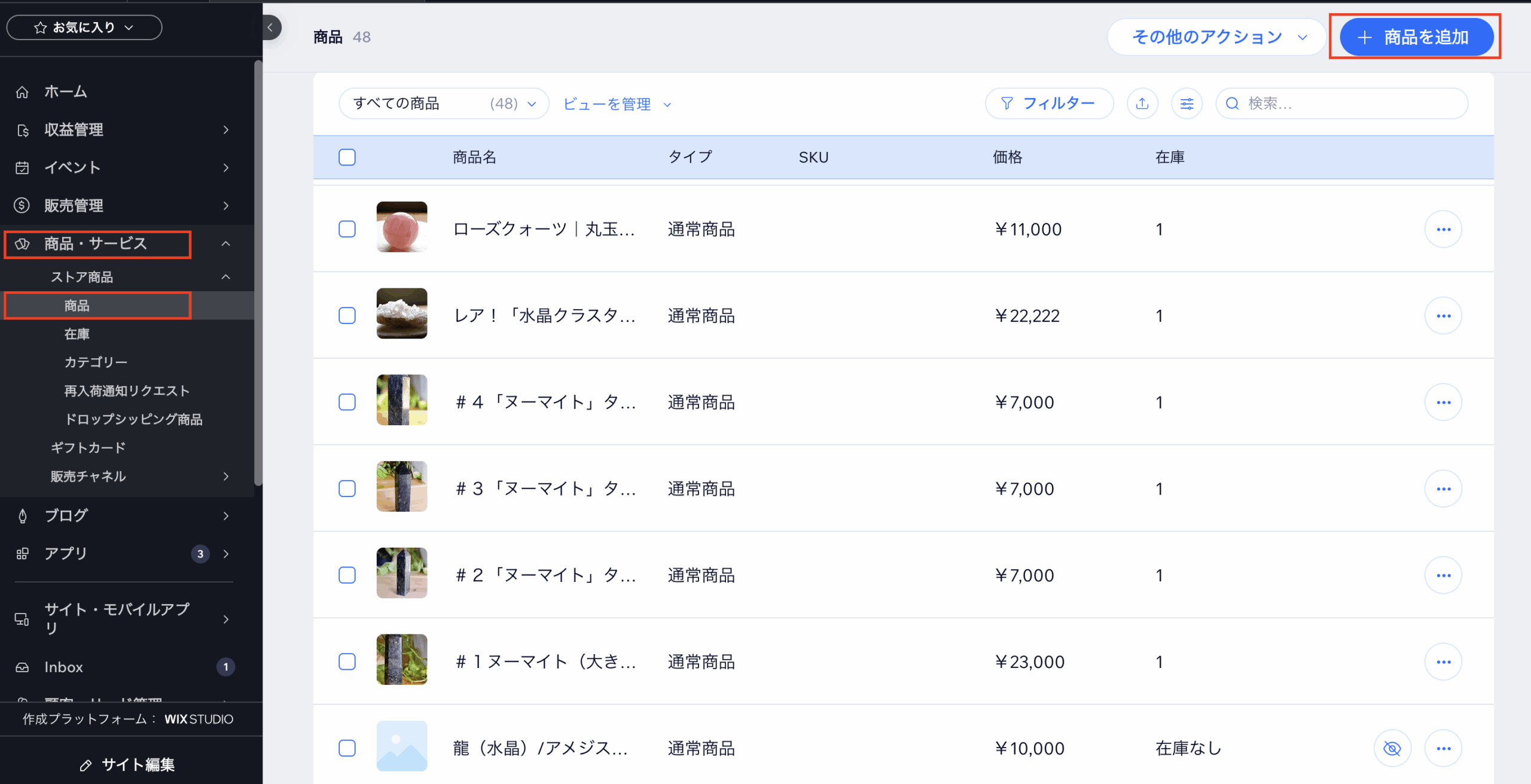 - 左側のメニューの「ストア商品 > 商品」をクリック