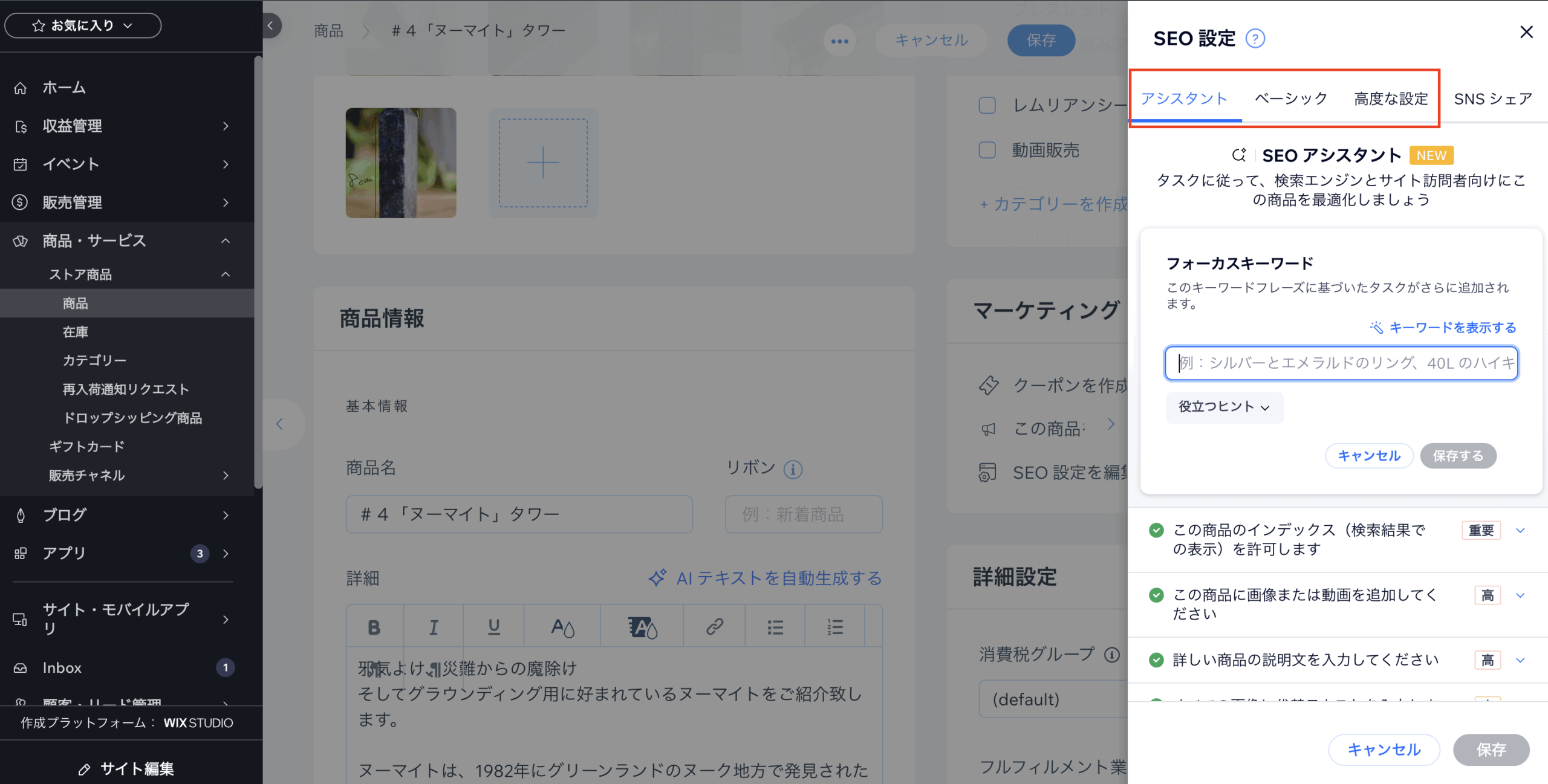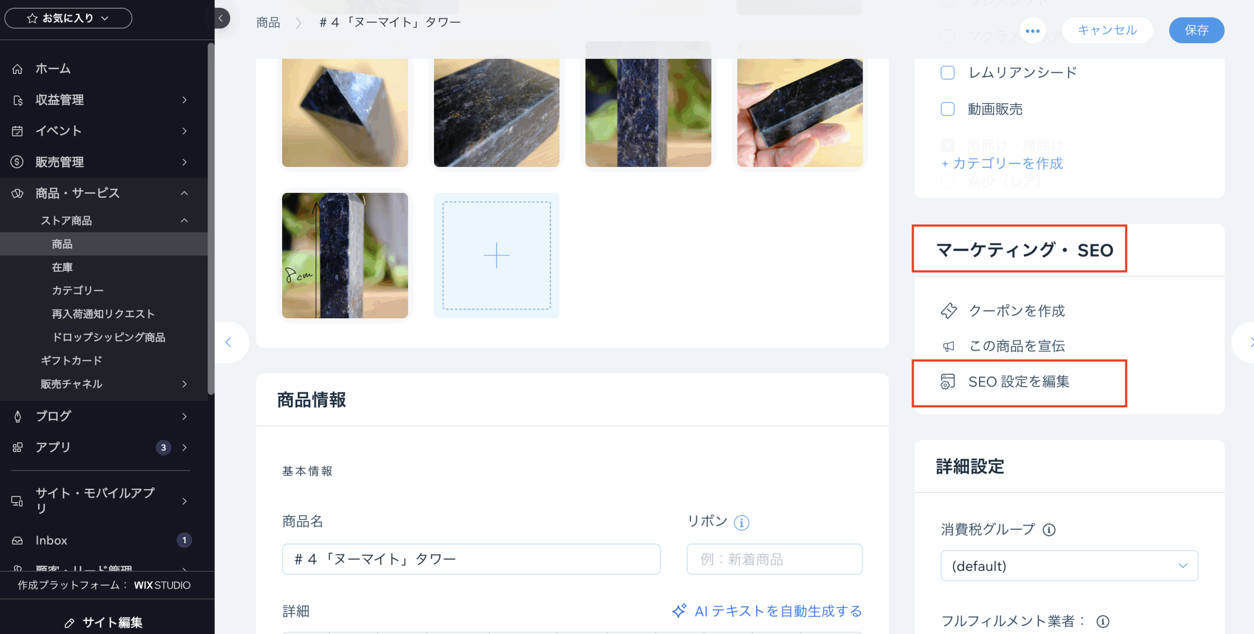 また、編集画面右側の「SEO設定を編集」から、タイトルタグやメタディスクリプションといったSEOに関わる設定を編集することができます。