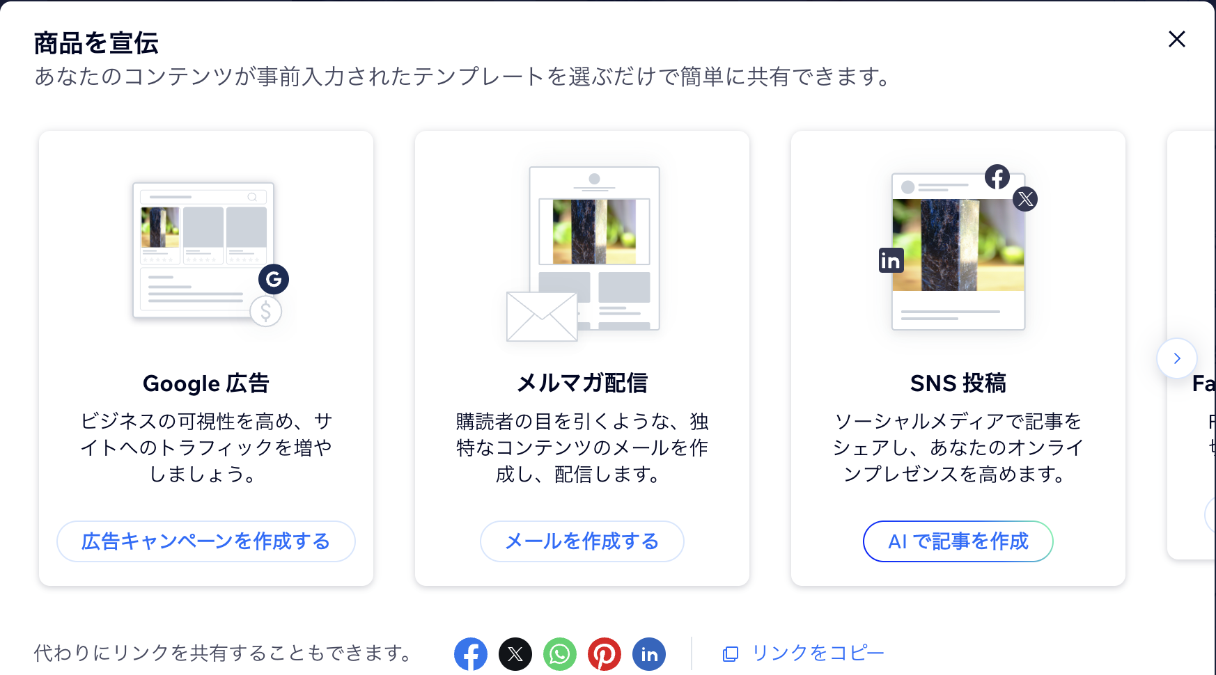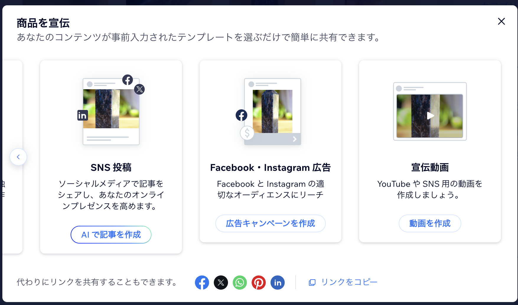 Wixには、クーポンの発行や商品の動画広告など、販促活動をサポートするさまざまなツールが用意されています。