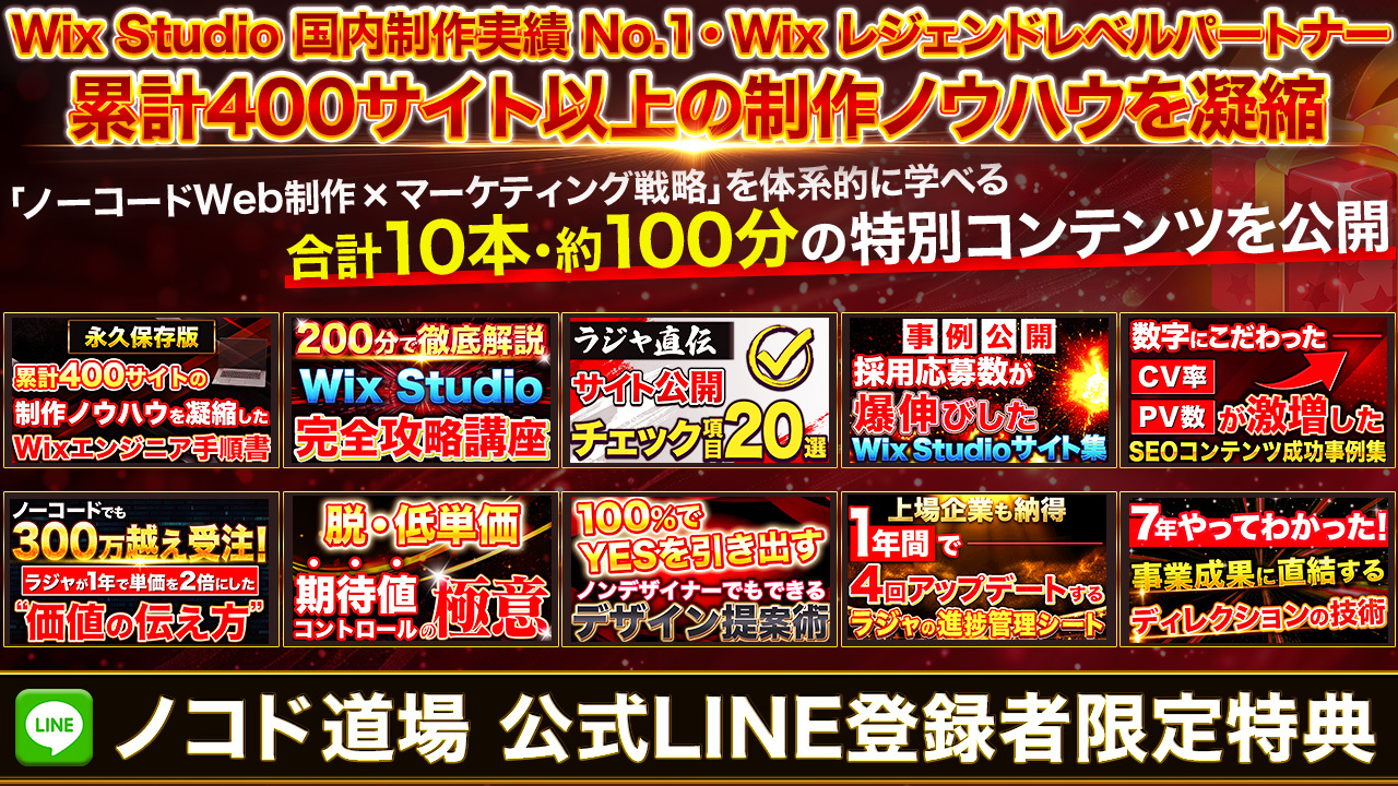 みなさん、こんにちは!株式会社ラジャのけんいちです。 今回は、 Wixを作っている上で急に浮き出てくるポップアップの設定をしたいなと思った時「キャンペーンや注意喚起表記」の作成する時に使う機能のライトボックの設置方法をご紹介していきます。 詳しくはYouTube 動画でもご説明しているので、こちらもご参考ください。 https://www.youtube.com/watch?v=Wj-1oXxYmP8 Wixとは? Wixのご紹介 Wix(ウィックス)とは、2006年にイスラエルで生まれ、現在全世界で 2 ...